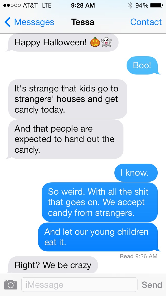 So in a world where all that stuff could affect your kid today or happen to your child tomorrow, I think it’s awesomely odd that parents just say, “screw you, bad crap” on Halloween and happily encourage kids to dress up like Dora and Explore the crap out of the neighborhood (or if you have really cool parents, they drive you to rich neighborhood across town where you get full-sized candy treats) by walking up to a hundred strange houses and demanding candy, which these strangers readily give, being threatened with some kind of “trick” if they don’t, perhaps involving the pulling down of one’s underwear. (Which also sounds shady in today’s world. It’s just a funny rhyme when you’re a kid. Sounds wrong with adult ears on.)