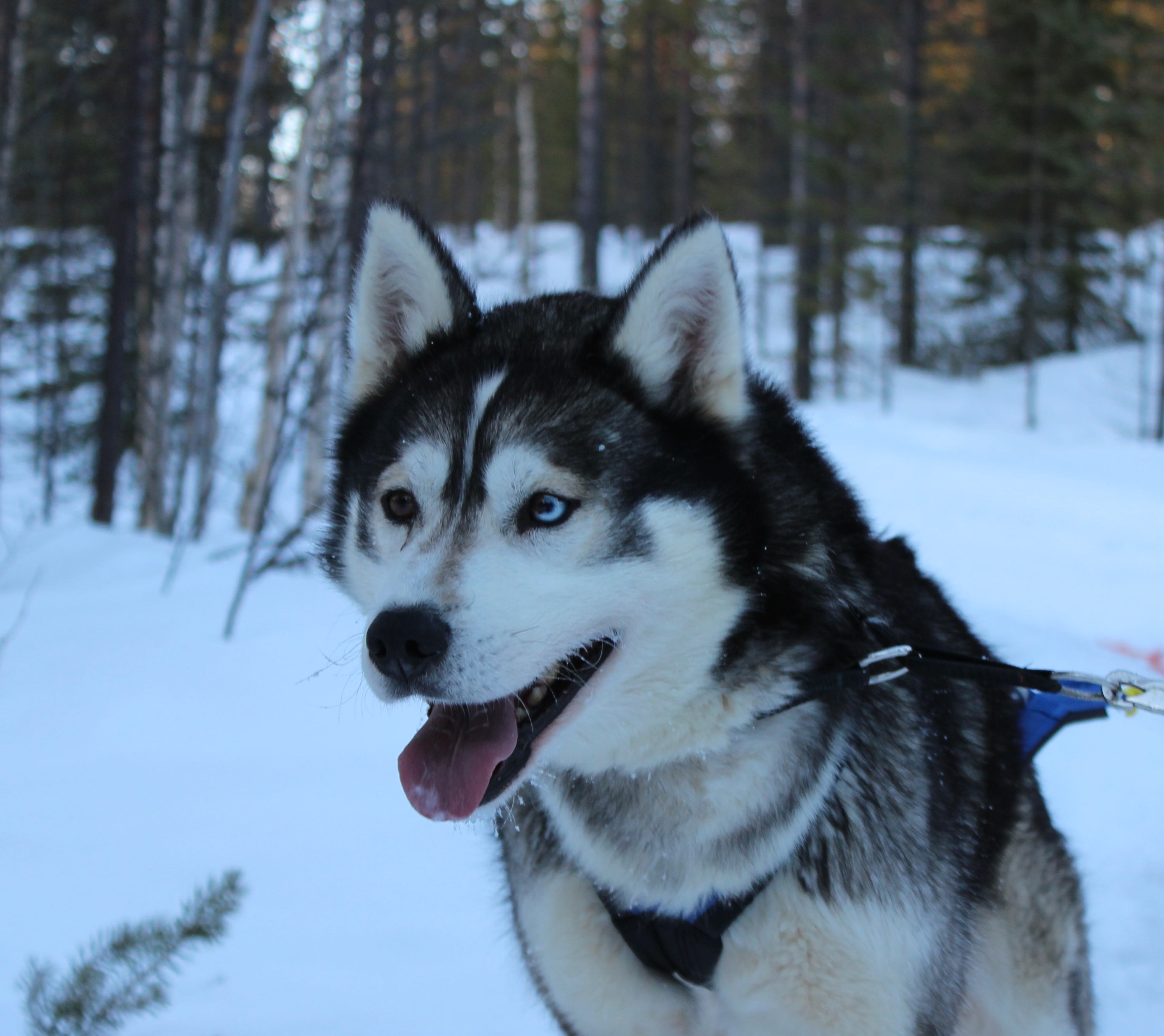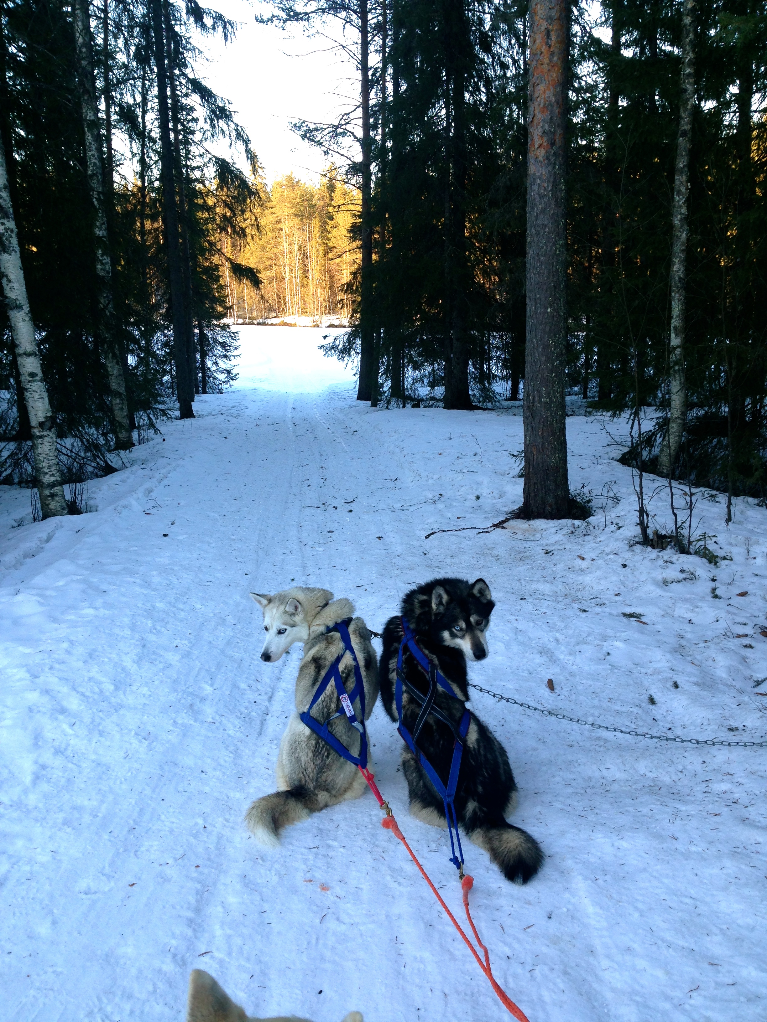 Eyes wide, brows raised, she stared at the 60 Siberian Huskies plus three Finnish Lapphunds waiting to be fed at Usvatanssin Kennel. Sixty three energetic pairs of eyes stared back at her, tails wagging in expectation. Another familiar look crossed her face: Yeah right.
