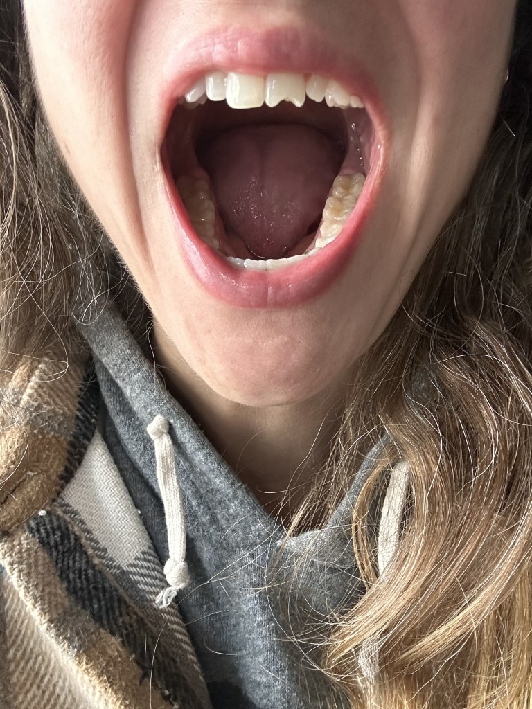 A nail hit me in the face. I mean that sucked. And it hurt like a bitch. (It still hurts.) BUT!! I must have been smiling because it didn’t even graze my lip! It could have taken out my eye! Punctured my cheek! My esophagus! Whacked off my ear! Smacked my brain! But it took out the lower part of my left tooth, the one thing I could fix today! (Or tomorrow. The emergency dentist deemed it less of an “emergency” than I did.) WHAT A GIFT!