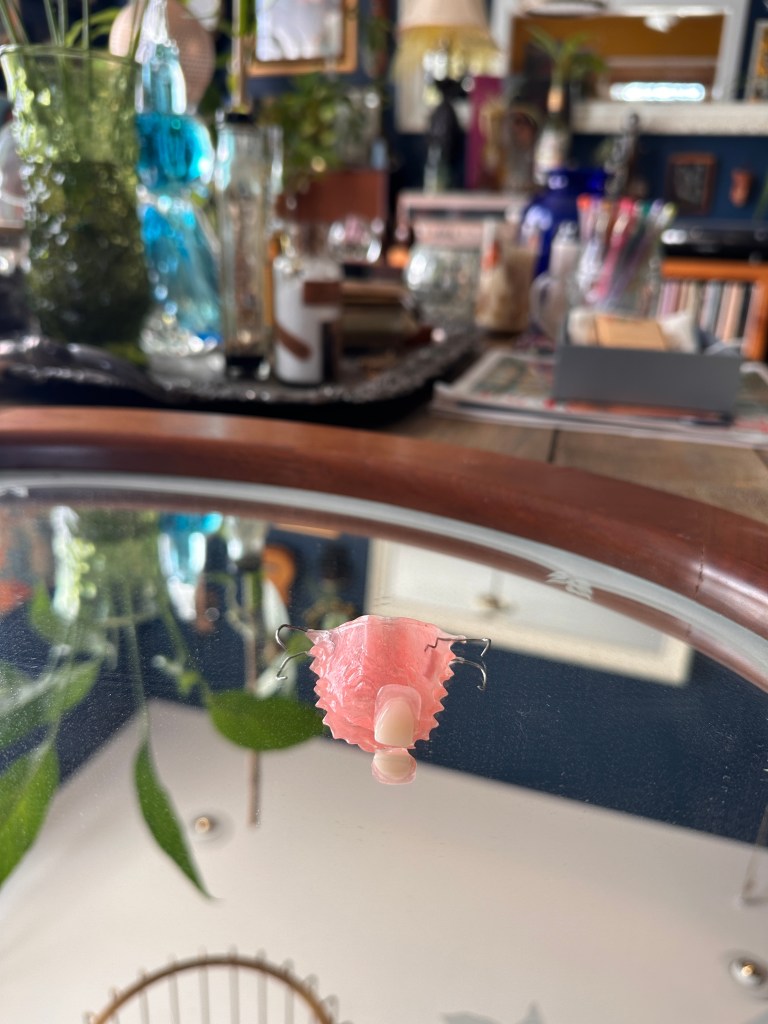 Remember that heat-seeking nail that attacked my face at Dog Dad Steve’s birthday and I was all like, what a gift! when it took a chunk of my front tooth instead of puncturing an eye or piercing a cheek or stabbing my throat? Turns out, it was playing the long game. Unlike bones, teeth can’t heal themselves and I had a visible fracture, but with my string of fairytale fortune and lack of insurance, I opted to give my body a shot. It did inch toward better every day, until it didn’t. Progress plateaued, leaving a slow’n steady death ache in its wake. The dentist I’d been avoiding confirmed the tooth had to go, not if but when.