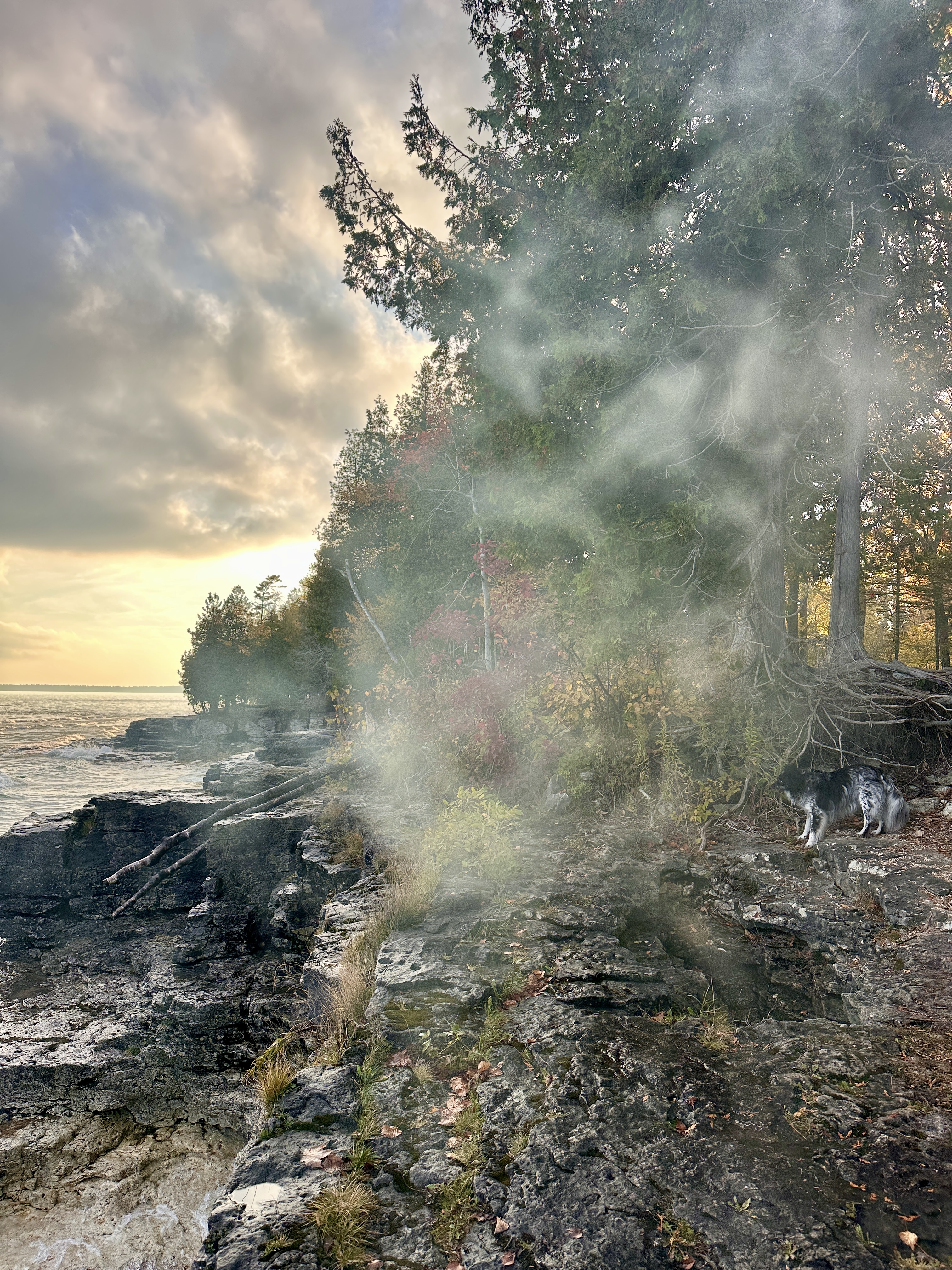 Mostly driven by what if the house is about to explode, like the main character in a horror film, I figured I should go investigate, or at the very least collect the dogs just in case. I found my house coat, walked downstairs where both Fred and Rapha were sitting on the couch with their WTF-was-that!? eyes staring at nothing, neither making a peep. Oh shit. Even the dogs are quiet. I’ve been mentally preparing to open my door to the apocalypse for years, trigger finger ready to speed dial my dad, “IT’S HAPP-EN-ING.” Everyone should have a theworldisending disaster plan (mine is just, call Dad). I peeked through the glass pattern on the door.